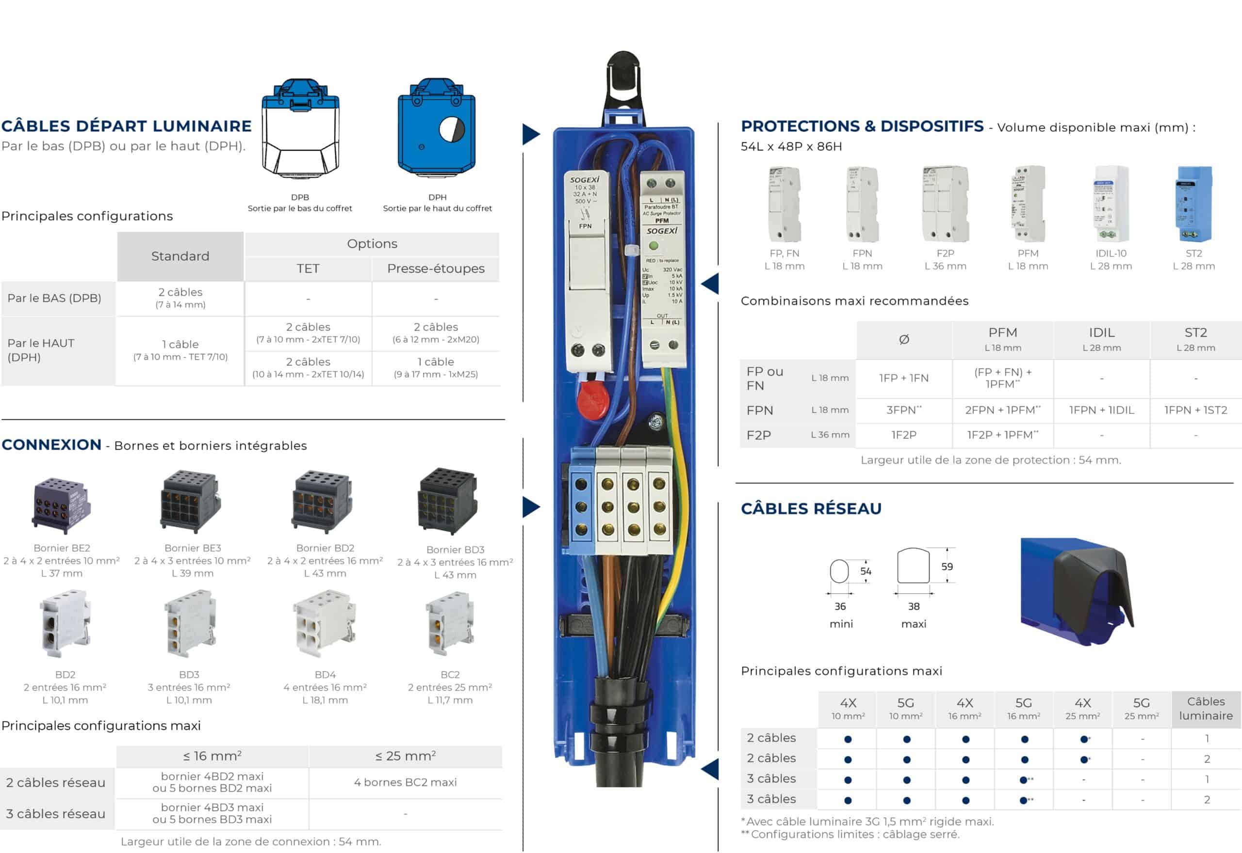 The Dynapak can connect up to 2 x 25mm² network cables or 3 x 16mm² network cables and 2 lighting fixture cable outputs.