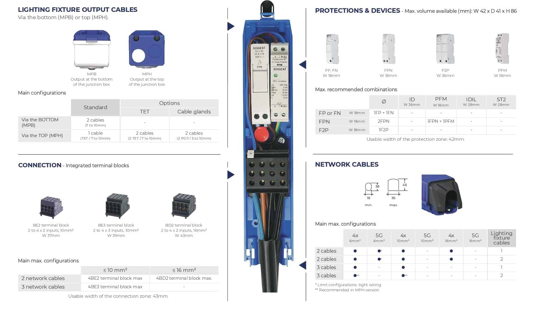 The Minipak can connect up to 3 x 10mm² network cables or 2 x 16mm² network cables and 2 lighting fixture cables.